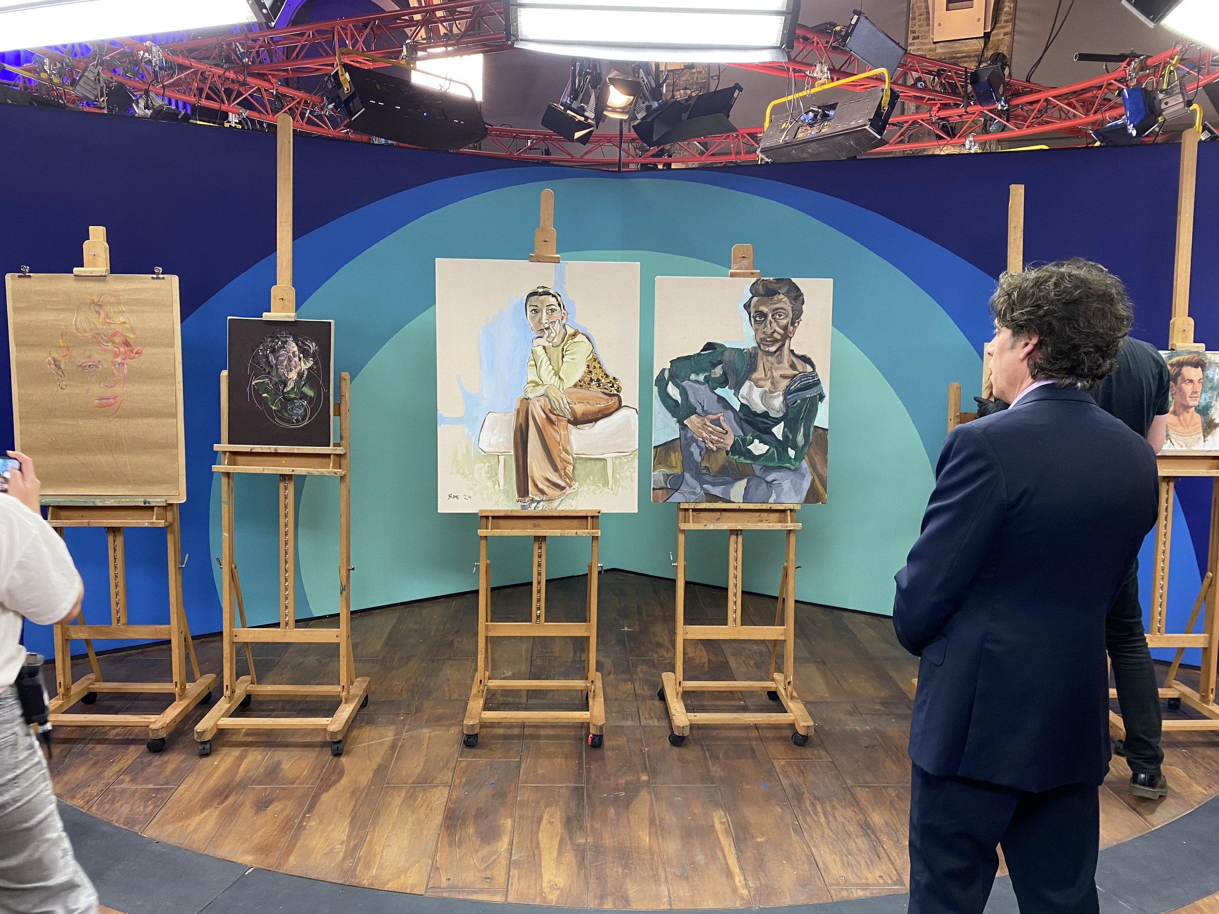 The next phase is what we refer to as ‘first marks’ where the cameras stand back and film the early stages of the portrait making process whether that's preliminary sketches, taking photos, under painting etc. The PDs then jump in and start asking questions as this is the meaty stuff, understanding what decisions artists make at this early stage, watching the blank canvas start to get covered etc. Stephen and the judges also start asking questions. We aim for them to try to meet every artist (and they very much want to) but the logistics of trying to get 4 of them to speak to all 9 artists means that sometimes not every judge gets to talk to every artist. However, they are always walking around watching the work progress and they update each other on what the artists are up to.